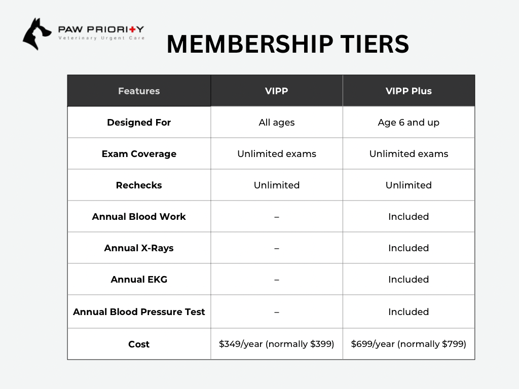 Your pet deserves more than just a vet visit—they deserve a veterinary partner. That’s why we built Paw Priority VIPP (Very Important Pet and Parent): a membership model focused on preventive wellness, priority urgent care access, and uncompromising quality of care.